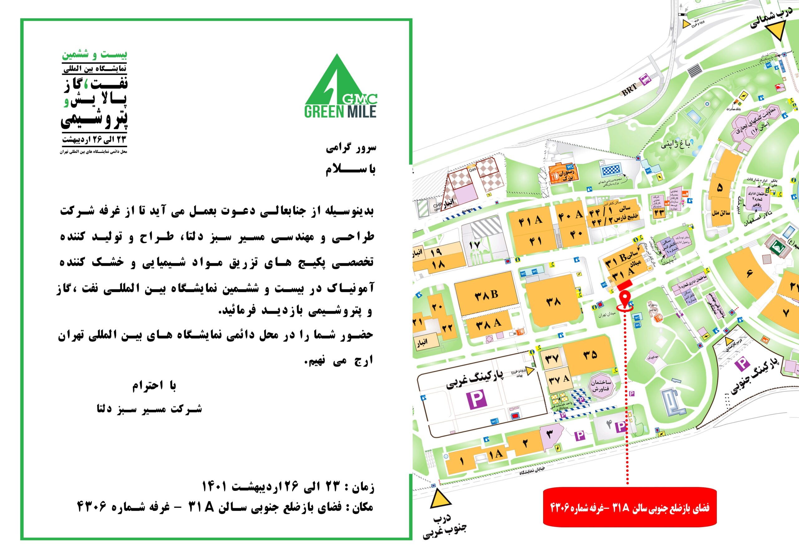 غرفه شرکت طراحی مهندسی مسیر سبز دلتا در بیست و ششمین نمایشگاه بین المللی نفت، گاز، پالایش و پتروشیمی ایران در فضای باز ضلع جنوبی سالن 31A- غرفه شماره 4306 واقع شده است.