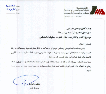 دریافت تقدیرنامه از شرکت مهندسی و ساخت بویلر و تجهیزات مپنا